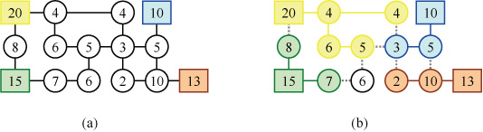 研究の概要: 現在,様々な問題が“グラフ”を用いてモデル化されている.グラフとは,い くつかの点と,それらの点同士を結ぶ何本かの辺からなるもので,いろいろな 構造を抽象的に表現することに優れている.例えば,図(a)はコンピュータネット ワークの構造をグラフで表現した例であり,各点は丸もしくは四角で描かれ,各 辺は直線分で描かれている.ここで,丸の点は端末を表し,四角の点はサーバを 表し,各辺はネットワーク(ケーブル)を表している. 本研究では,ビデオ・オン・デマンド用ファイル転送問題や電力系統の配電融 通問題などに応用がある「需要点と供給点があるグラフの分割問題」を扱った.グ ラフの各点には“需要点”または“供給点”の役割が与えられ,それぞれに“需要 量”または“供給量”と呼ばれる正の実数が与えられている.このとき,できるだ け多くの需要を満足したい.即ち,供給を受けている需要点の需要量の合計を最大 にするようなグラフの分割を見つけたい.例えば,図(a)のグラフに対し,図(b)は グラフ分割の一例を示している.ここで,各供給点は四角で描かれ,各需要点は丸 で描かれている.また,図(b)において,供給を受けている需要点は,その供給元 の供給点と同じ色で塗られている.このような分割を見つける問題は,ビデオ・オ ン・デマンドにおいてサーバの割当方法を見つける問題や,電力系統において停電 の復旧方法を見つける問題などに応用できる. この分割問題は,たとえグラフが“木”と呼ばれる単純な構造をしていても,い わゆるNP困難な問題である.したがって,木に対してさえ最適解を高速に求めるこ とは絶望的である.そこで本研究では,木に対して最適解に極めて近い近似解を高 速に求めることができる近似アルゴリズムを与えた.このアルゴリズムは完全近似 スキーム(FPTAS)と呼ばれるものになっており,いわば最良の近似アルゴリズム である.受賞の感想: この度は,野口研究奨励賞をいただくことができ,たいへん光栄です.これも西 関教授,周准教授をはじめとする先生方のご指導のおかげです.東北大学に学部生 として入学してから約10年になりますが,この東北の地で研究者としての私を基礎 から育てていただきました.この賞を励みに,今後も研究に取り組んで参ります. これからもご指導,ご鞭撻の程よろしくお願いいたします.