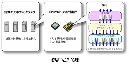 研究の概要: 今回の受賞理由となった論文では、描画処理ユニット(GPU)を搭載するPCで構成されるPCクラスタシステムを 用いて、大規模データのクラスタリングを実現する手法を提案しています。提案手法では3種類の異なる粒度 での階層的並列処理によって、大規模データクラスタリングの処理の大幅な高速化を達成しています(図1)。 提案手法では、まず分割統治法によってデータクラスタリングの処理を分割し、各PCへと分配します。それぞ れのPCでは、CPUとGPUとで処理を分担して並列実行を行います。ここでGPUを利用することによって、従来では 利用困難であった細粒度データ並列性に基づく並列処理を実現し、データクラスタリングの処理時間の大半を 占める最近傍探索処理を飛躍的に高速化しています。一方、最近傍探索以外の処理はGPUでの効率的な実行が 困難であるため、従来どおりCPUで処理しています。CPUとGPUとで適切に役割分担して協調動作させることに よって、GPUの高い演算能力による処理時間の大幅な削減と、CPUのプログラミングの柔軟性による高度で複雑 なアルゴリズムへの対応との両立を可能にしました。 また、クラスタリングアルゴリズム自体の改良という観点からも研究を進めており、参考論文2はその成果の 一部です。部分歪み理論に基づく「部分歪みエントロピ」を基準としてクラスタ構成を更新し続けることに よって、統計量の動的変化に高速に追従する適応的クラスタリング手法を提案しています。部分歪みエントロ ピを最大化するようにクラスタを更新し続けることによって、従来手法で必要とされてきた経験的パラメータ を用いることなく、統計量の動的変化に高速に追従可能であることを明らかにしました。受賞の感想: このたび栄誉ある野口研究奨励賞を受賞することができ、大変光栄に思っております。これもひとえに、 学生時代から今日に至るまでに小林広明教授を始めとする多くの先生方、および諸先輩方から頂いたご指導 ご鞭撻の賜物であります。心より厚く御礼申し上げます。